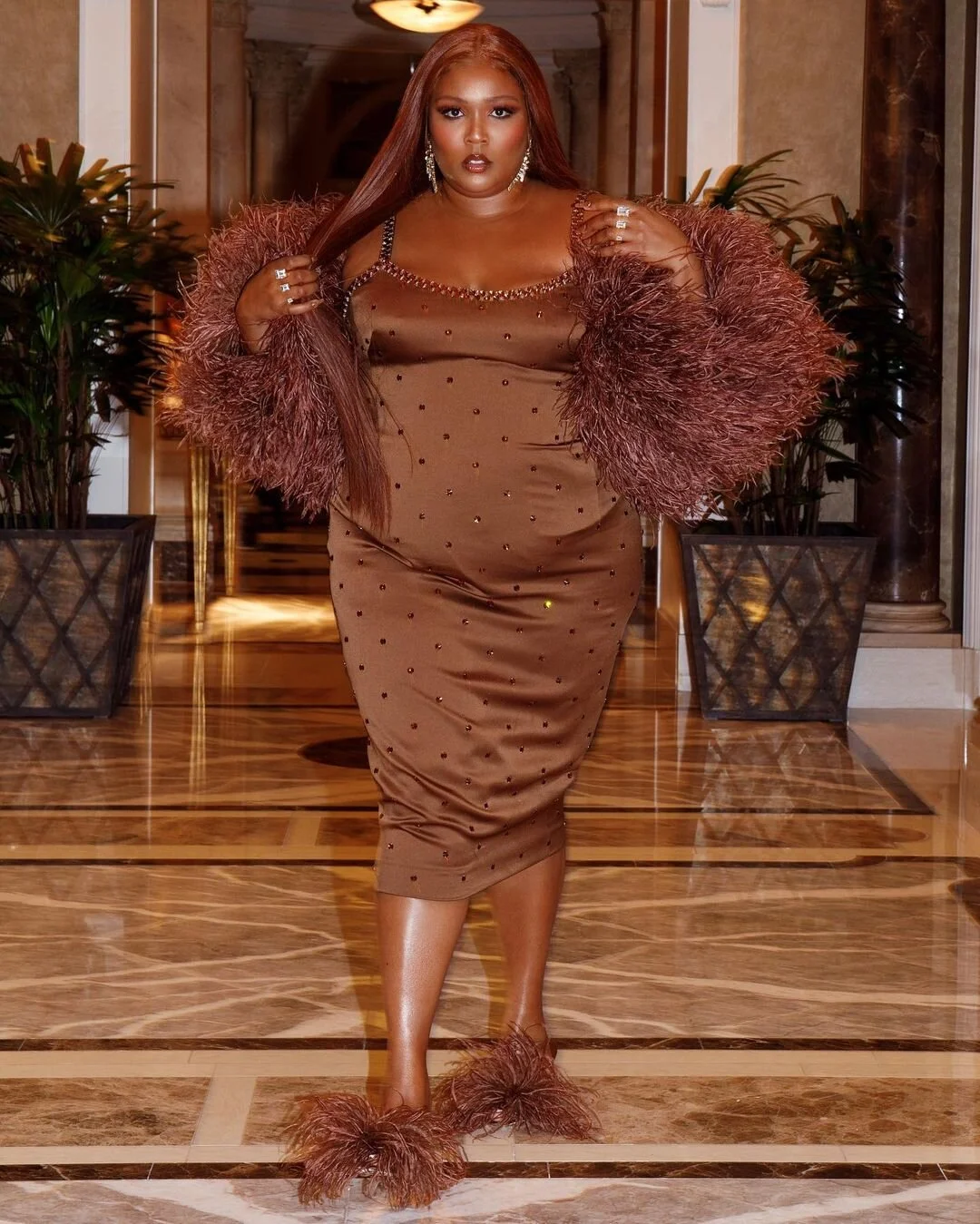 Lizzo wearing: custom Balmain, custom Dolce & Gabbana, and Moschino F/W 2014