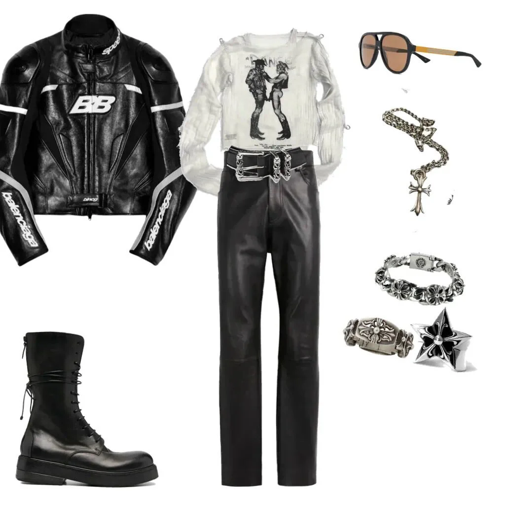 Balancing jacket, Vivenne Westwood x Tom of Finland shirt, Ann Demeulemeester boots, Gucci glasses, and Chrome Hearts jewelry.